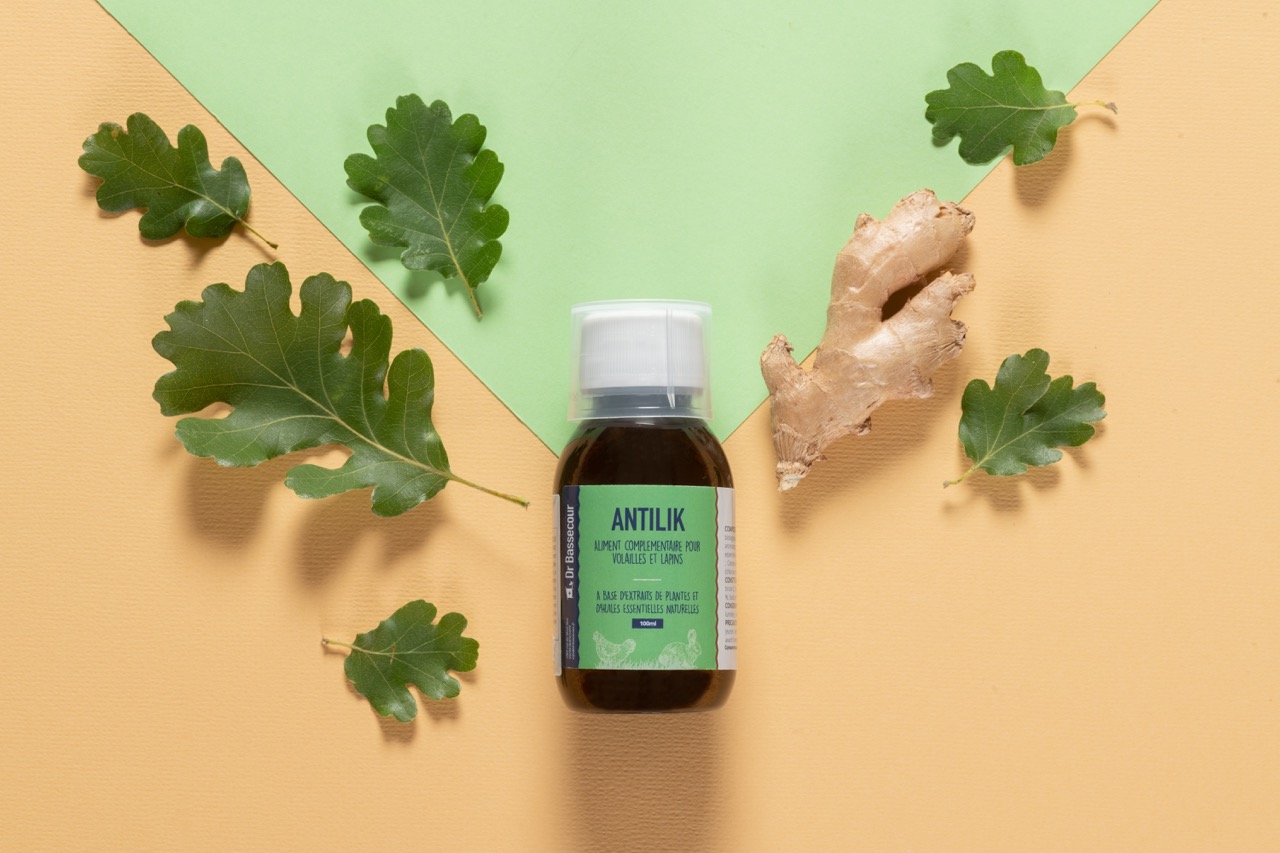 Aliment complémentaire pour volailles, lapins et pigeons à base d’extraits de plantes et d’huiles essentielles naturelles.