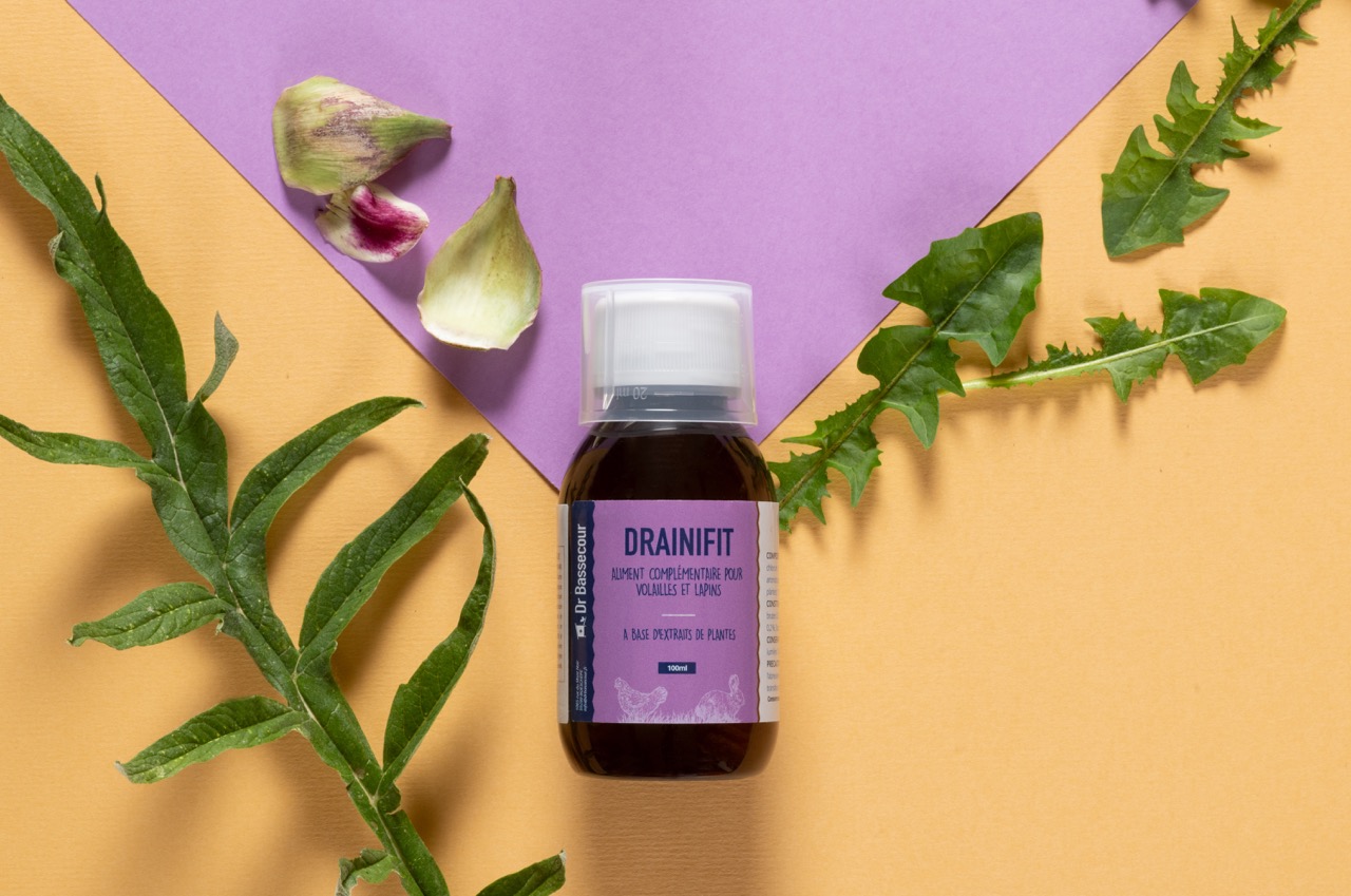 Aliment complémentaire pour volailles, lapins et pigeons à base d’extraits de plantes et d’huiles essentielles naturelles.
